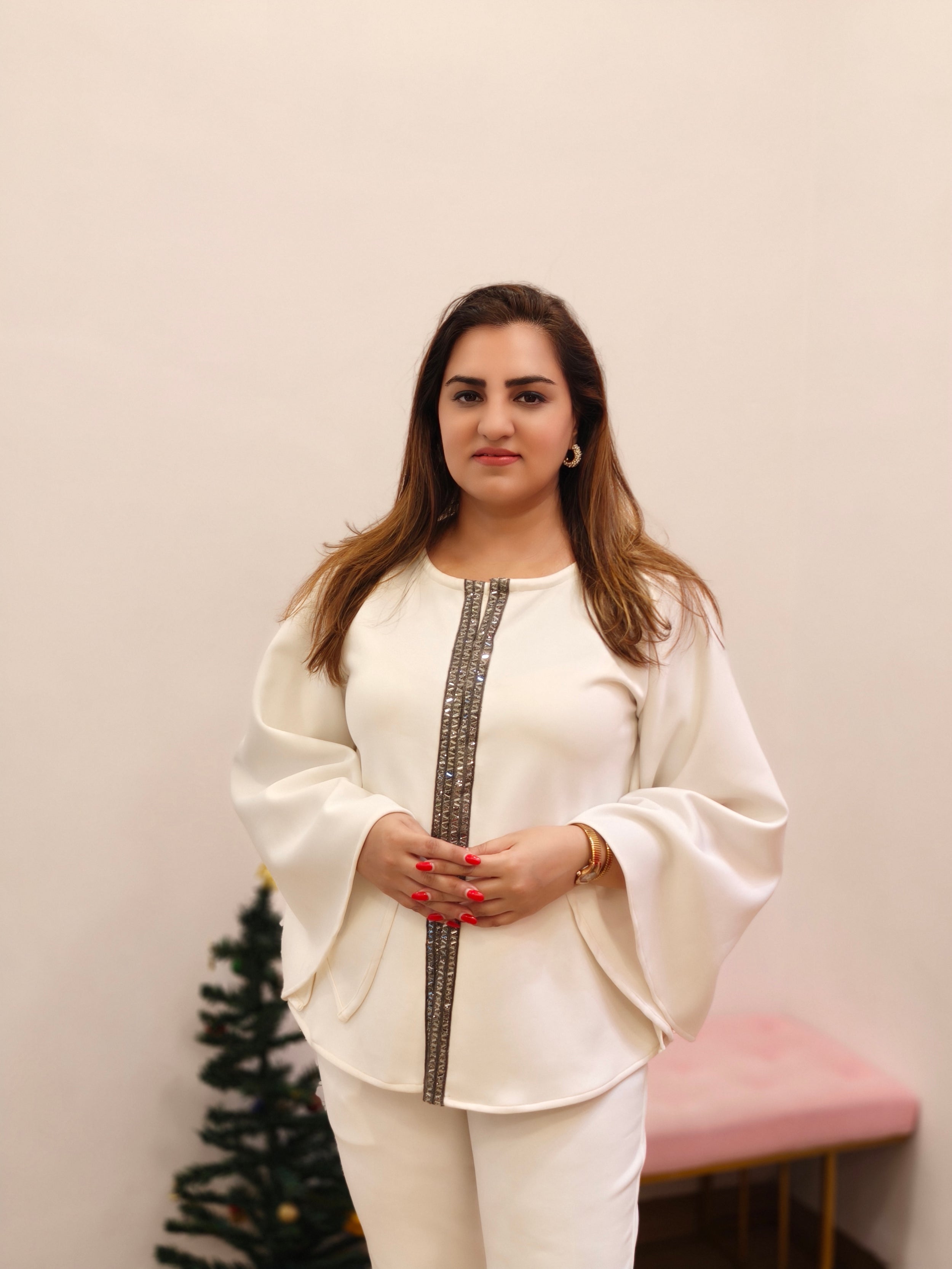 This set is designed for a sleek yet relaxed look. The flowy blouse and fitted pants are adorned with subtle silver embellishments, blending comfort with a touch of glamour, perfect for