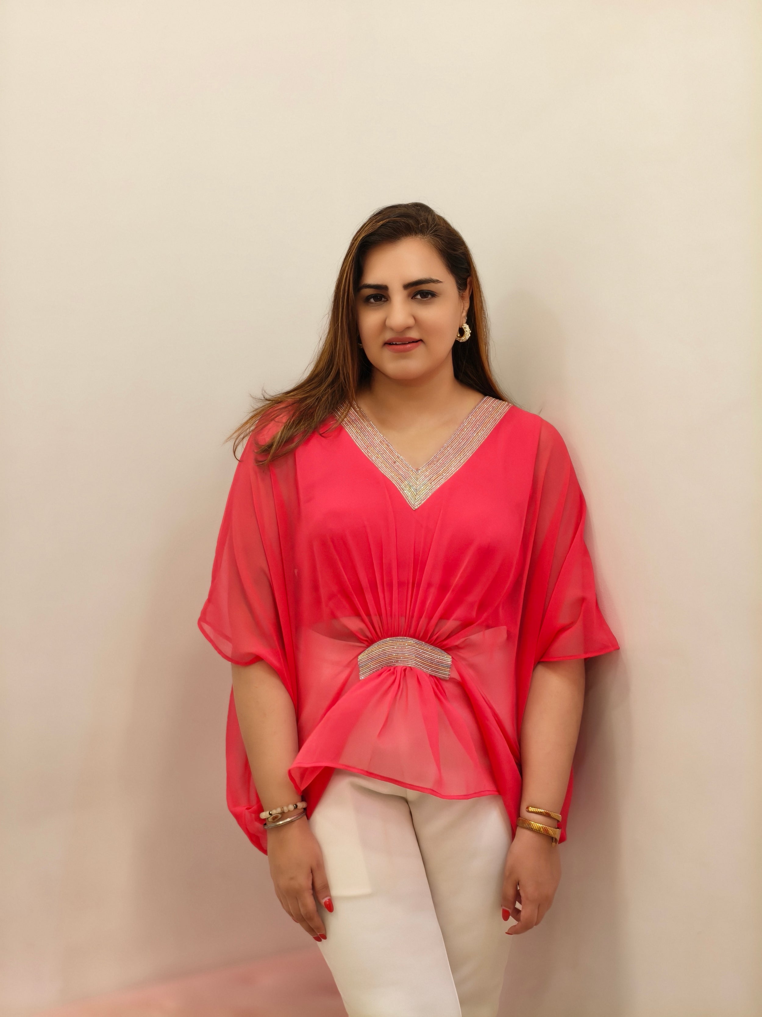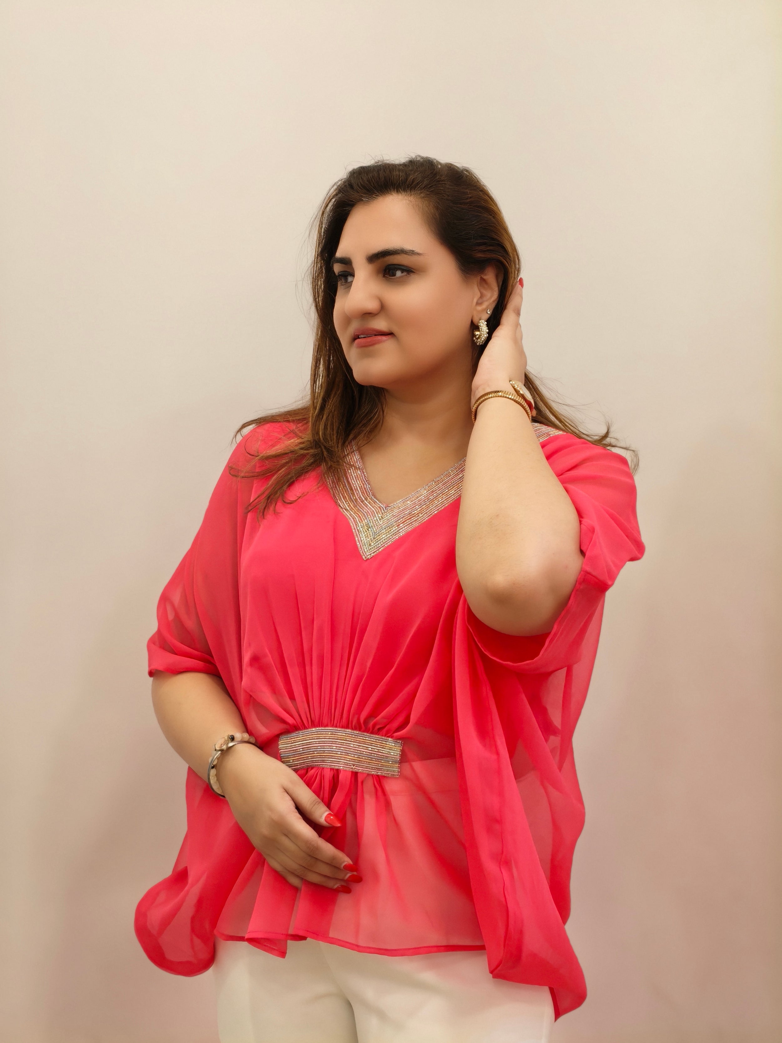 TUZK's Sunehra Kaftan is a statement piece made from soft georgette, featuring some intricate sequence embroidery. The flowing design and lightweight fabric provide a graceful look with an eye-catching sparkle.