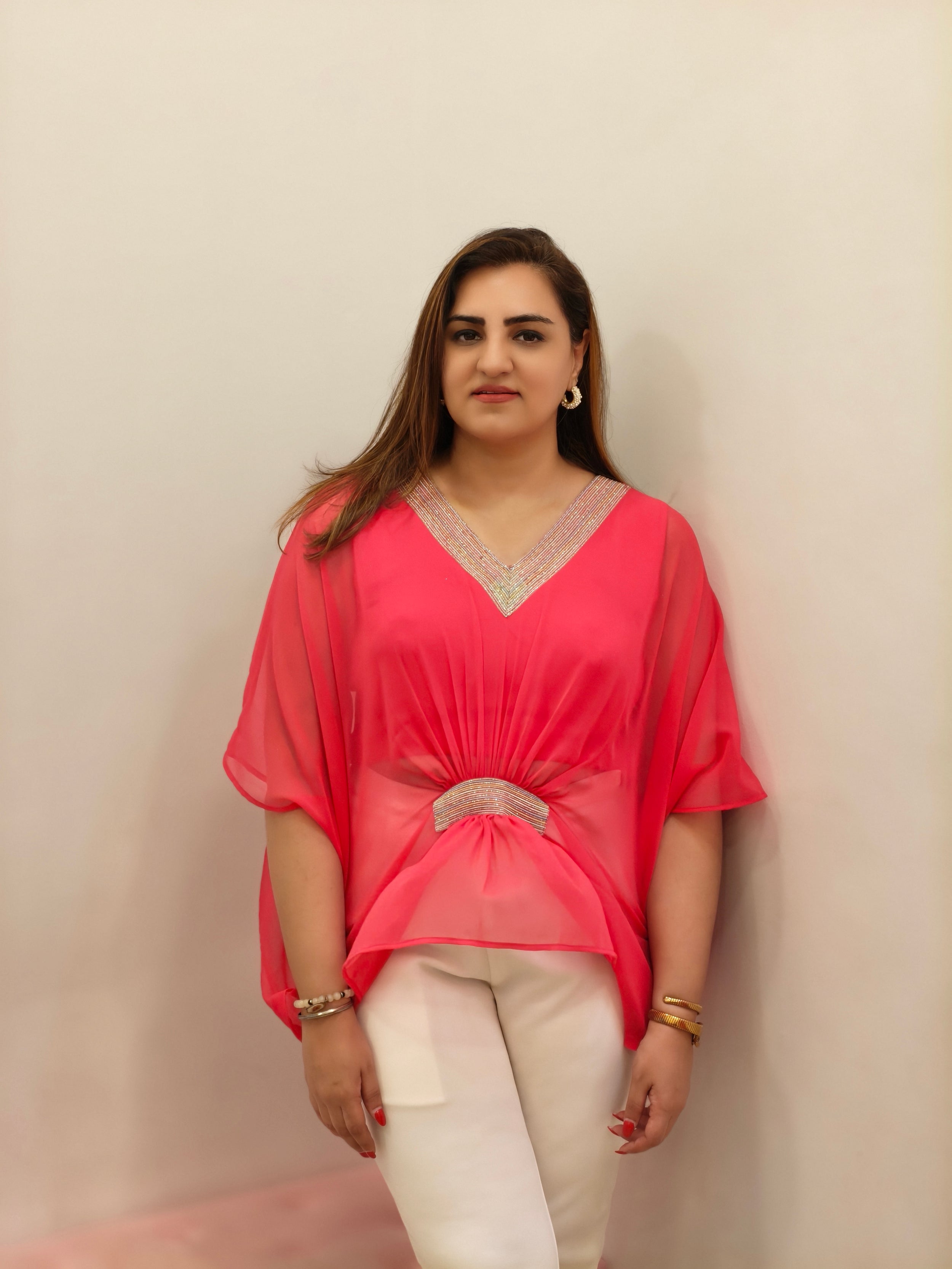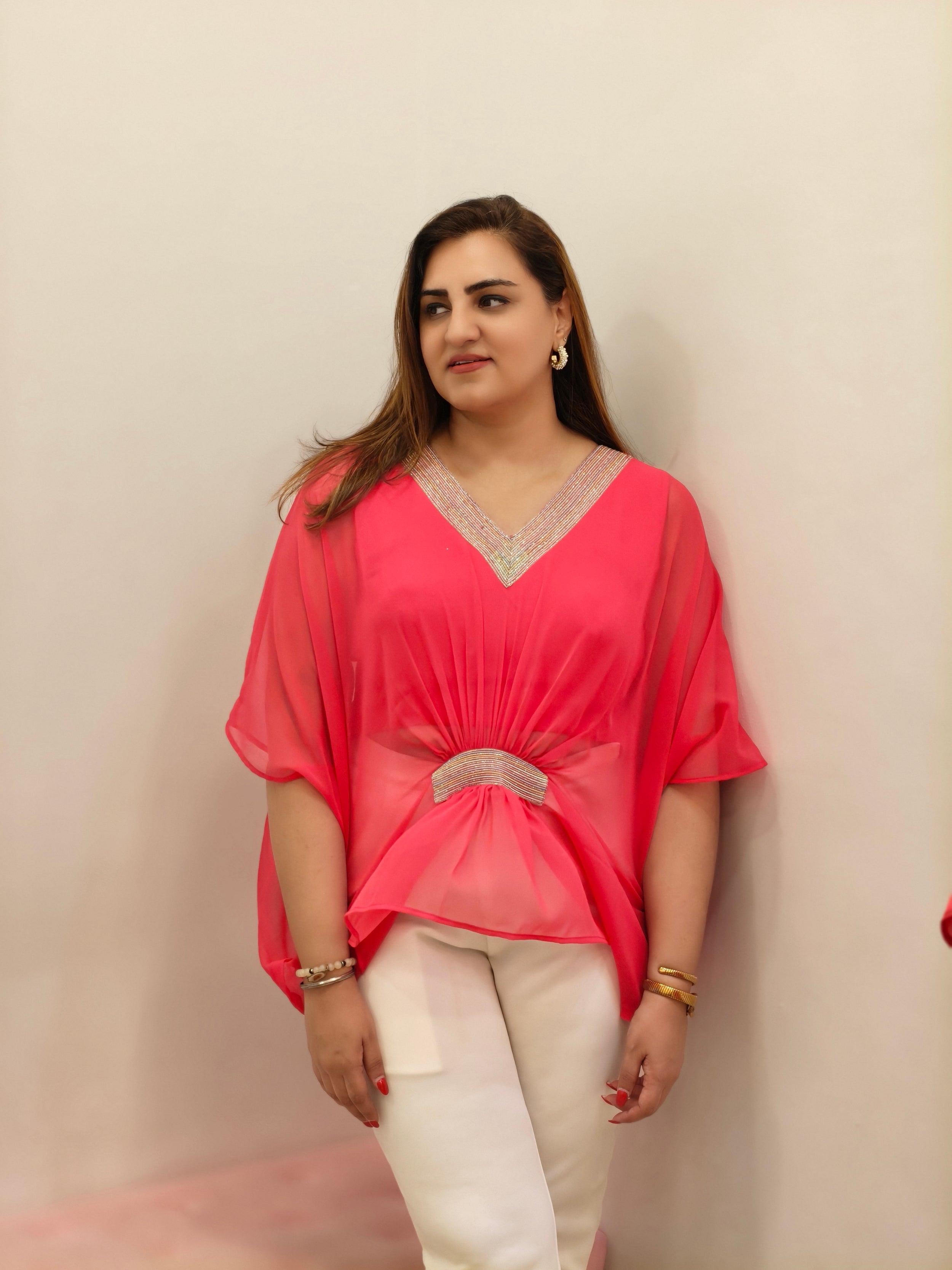 TUZK's Sunehra Kaftan is a statement piece made from soft georgette, featuring some intricate sequence embroidery. The flowing design and lightweight fabric provide a graceful look with an eye-catching sparkle.